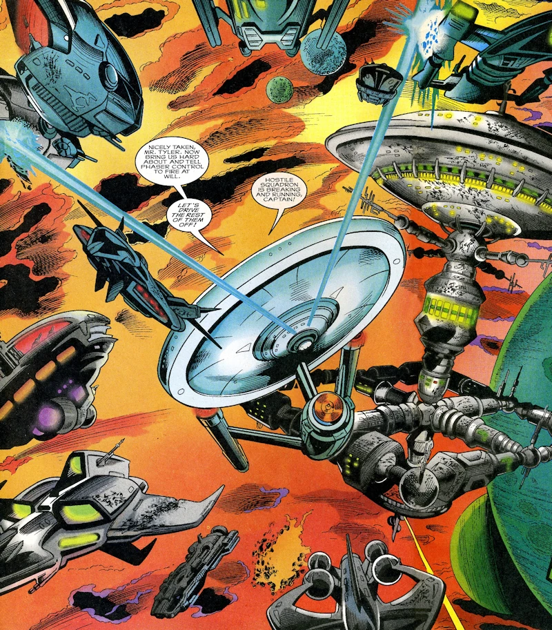 The Enterprise driving off brigand forces at Starbase 13