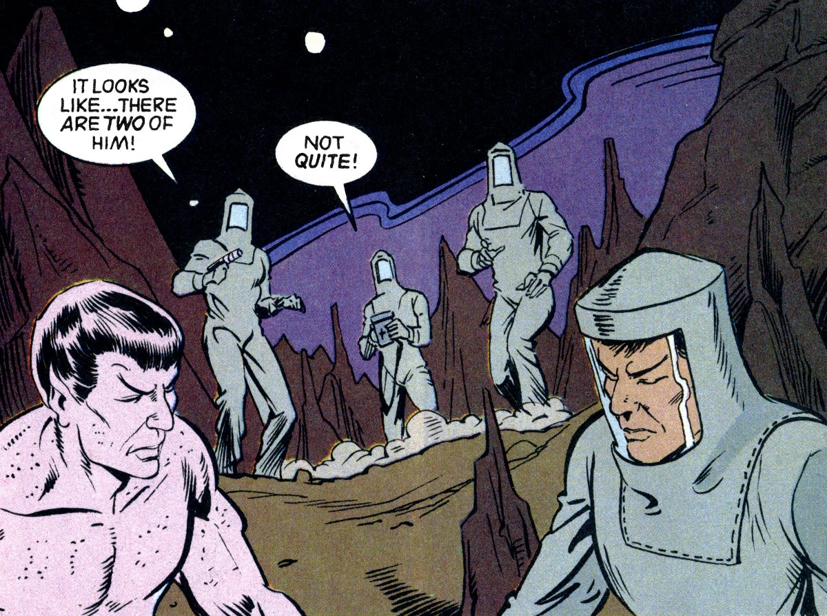 - TOS comic: "The Mimicking Menace" – A Tactisian tried duplicating Spock, but found his biology complicated.