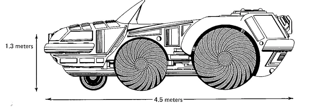 The model L tunnel runner was 4.5 meters long and 1.3 meters tall. The cockpit, open with a protective windshield, had room for a driver and two passengers. Tall, thick, highly treaded wheels provided traction. A well-trained, experienced driver could maneuver the vehicle safety at speeds up to 40 kilometers/hour. (FASA RPG module: Witness for the Defense)