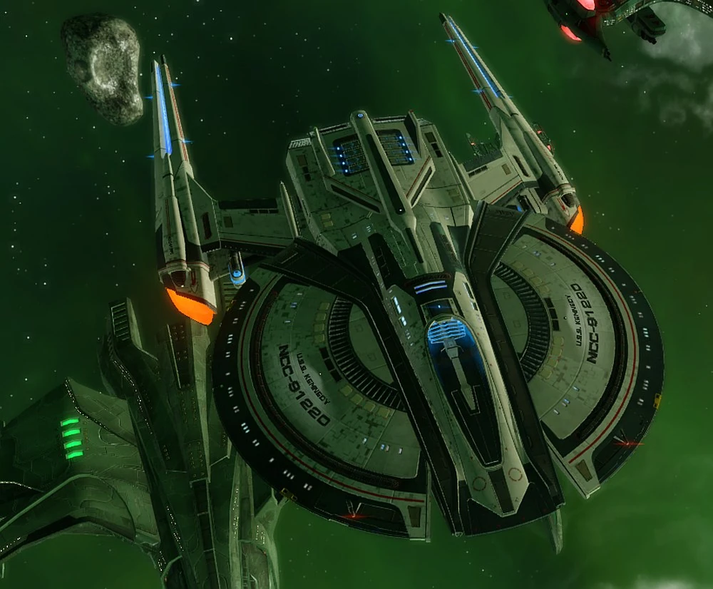 The USS Kennedy (NCC-91220) was a 25th century Federation starship, a tier 6-rated Shenzhou-class light battlecruiser[2] in Starfleet service in the 2410s decade. (STO - The Iconian War mission: "Broken Circle")