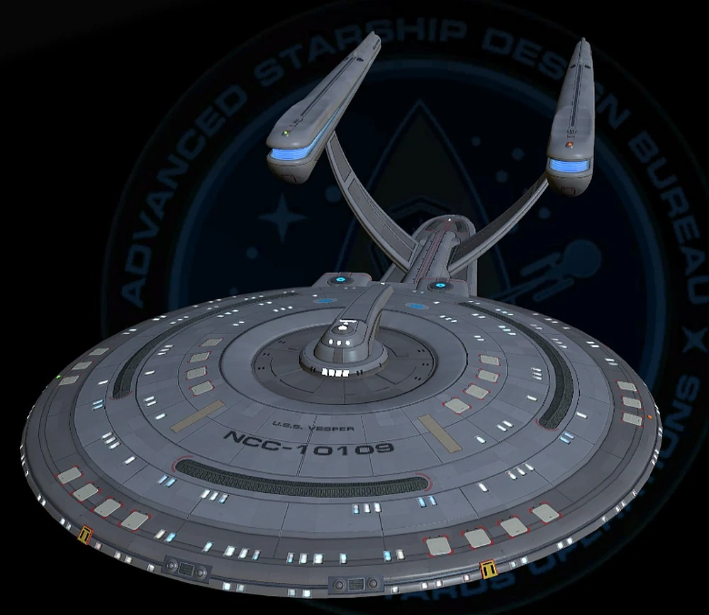 The Vesper was a modern variant of the venerable Constitution-class and its Enterprise-subclass refit. It was a sister design to the 2390s[2] USS Excalibur (NCC-94547), itself an evolution of the 23rd century Constitution class. The Vesper incorporated design cues of the larger Excalibur-class starship. (STO - Klingon War mission: "Welcome to Earth Spacedock")