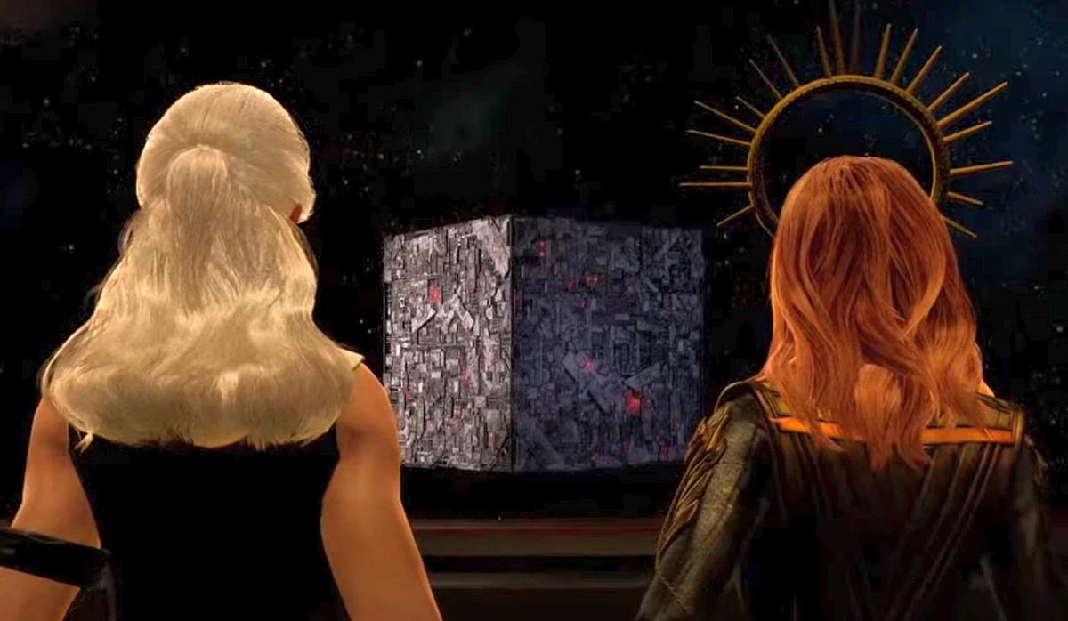 Following the abdication of Wesley Crusher as Emperor of the Terran Empire and the accession of Empress Leeta in the year 2411, Leeta and Terran Marshal Kathryn Janeway studied a Borg cube with red instead of prime universe green lights. The women agreed they had work to do. (STO - Terran Gambit mission: "The Fujiwhara Effect")