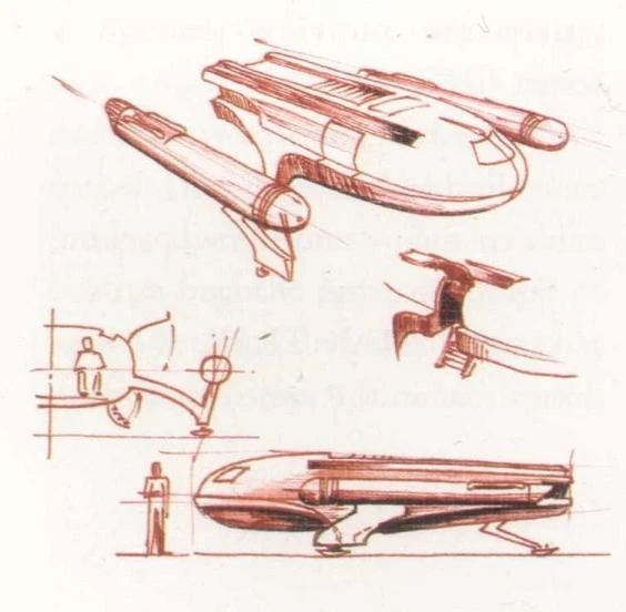 - Star Trek: The Original Series art director and production designer, Matt Jefferies, designed this teardrop-shaped shuttle for the TOS episode: "The Galileo Seven" but, due to the curved hull being expensive to reproduce, the now familiar flat-sided F-class shuttlecraft was constructed instead. (ST reference: The Art of Star Trek; Star Trek: The Magazine Issue 12: "Designing the Galileo Shuttlecraft")