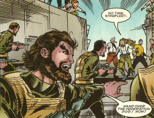 When Kaaj was hunting for Christopher Pike after his shuttlecraft crashed on the planet Prairie he sent two assault squads to track him down. The second squad, of at least five men, led by a Klingon with a thick beard, made their way to the harvester rig Rostok, where Pike had taken shelter. Pike, and the former Starfleet officer Claire Thorn (who worked on the Rostok), fought off the Klingons long enough for Pike to make an escape on a skimmer. Thorn was knocked unconscious by one of the Klingons as Pike got away, but survived the attack. (EV comic: "The Flat, Gold Forever")
