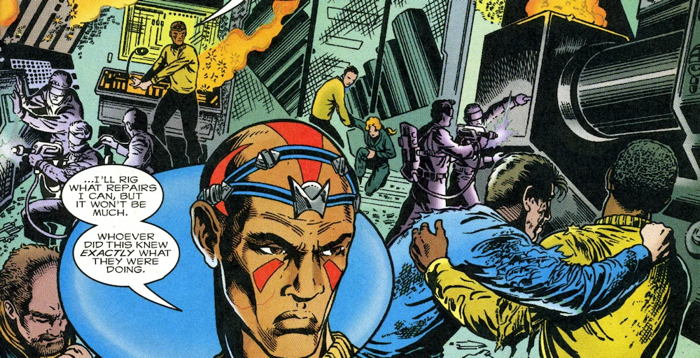 Following an extremely damaging attack on the Enterprise by the IKS Varchas over the Pharos siteworld in 2254 many of Chief Grace's crew were injured. Many of those still capable donned specialised equipment to rig repairs as quickly as possible as the battle continued. (EV comic: "The Fires of Pharos")