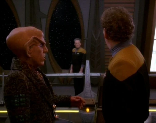 The Romulan delegation meet with Commander Sisko and Major Kira and express their displeasure with the intelligence that the crew have gathered on the Dominion and demand access to more information. Ruwon comments that his people consider the Dominion to be the greatest threat to the quadrant.