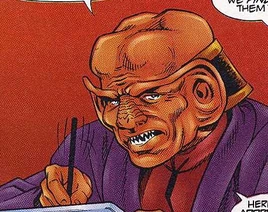 After the Bajoran wormhole was discovered in the year 2369, Zemel traveled to the galaxy's Gamma Quadrant in search of business opportunities. During the boom in travel to the Gamma Quadrant, Zemel found himself brokering information and other deals in a bar on the planet Caldonia III. When Jadzia Dax, Julian Bashir and Koleth visited the bar looking for information regarding the fate of the Klingon Empire battleship IKS K'Tang, they were directed to Zemel. While Dax attempted to flirt with him by complimenting his earlobes' sex attributes, Koleth simply threatened him with death. Zemel directed the trio to meet with Mavok Bev Nareen. (DS9 - Hearts and Minds comic: "On the Edge of Armageddon")